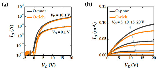 Next, the effect of OFR on the electrical characteristics of the a-IGZO TFT devices was observed. Figure 5a shows the pristine electrical characteristics of the O-poor and O-rich devices.