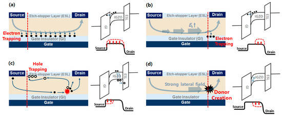 Figure 3. Schematic structures and energy band diagrams of four different mechanisms of VT shift in IGZO TFT device: (a) Electron trapping at the GI layer by vertical electric field; (b) Electron trapping at the drain-side GI layer by HCI; (c) Hole trapping at the source-side ESL by impact ionization; (d) Donor-like state creation in the drain-side IGZO layer by lateral electric field.