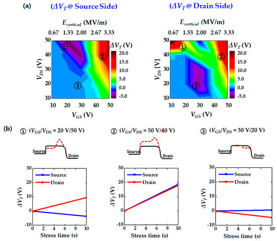 Figure 4a shows VT shift contour maps at the source and drain sides under various stress conditions (VGS and VDS biases). The VT change was observed after applying a stress bias for 10 s to the O-poor devices. This contour map helps to easily identify the VT instability characteristics for various stress bias ranges. Interestingly, three stress-bias regions with different VT shift trends were observed.