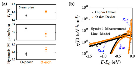 Figure 5. Characteristic comparisons between O-poor and O-rich a-IGZO devices: (a) Electrical characteristics (threshold voltage, mobility, and hysteresis) of O-poor and O-rich devices; (b) Experimentally extracted DOS distributions of two devices by using MPCV method. Black and orange symbols indicate O-poor and O-rich device, respectively.
