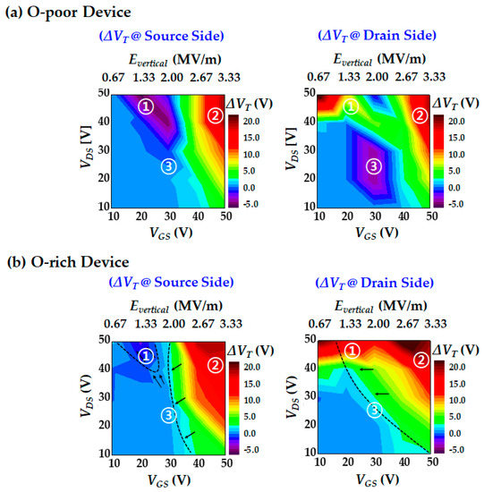 Figure 6 shows the contour maps of the VT shift after 10 s of stress applied to the gate and drain electrodes. The two graphs in Figure 6a are ΔVT of the O-poor device and the others in Figure 6b are those of the O-rich device. The left graphs are ΔVT at the source side, and the right graphs are those at the drain side. Compared with the O-poor device, the O-rich device exhibited the following changes in each stress bias region (①, ② and ③).