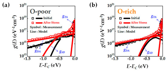 To further analyze this, DOS was extracted before and after applying the stress bias of region ③ (VGS = 30 V and VDS = 20 V), as shown in Figure 7. The O-poor device exhibits an increase in the donor-like state(gSD) after stress, whereas the increase in the donor-like state of the O-rich device is relatively small, as seen in Figure 7b.