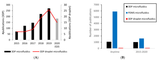 First, we evaluated the popularity of 3DP microfluidics and 3DP droplet microfluidics in recent years, based on the number of publications. We also compared the popularity of 3DP microfluidics and polydimethylsiloxane (PDMS) microfluidics. Our evaluation is based on Web of Science, and all search parameters and results can be found in Table S1 in supplementary material S1. As shown in Figure 1A, the number of publications in 3DP microfluidics has increased close to four times in the last five years. The trend is similar with 3DP droplet microfluidics, although the number of papers is still far smaller (Figure 1A). This smaller number only indicates that 3DP droplet microfluidics is a new and upcoming field within 3DP microfluidics that is rapidly gaining interest. It is also very clear that PDMS-based microfluidics is by far the most popular option for chip fabrication among researchers (Figure 1B). This is evidenced by the close to five times difference in the number of publications compared with 3DP microfluidics when we search without a time limit. However, if we search only within the last five years, it becomes clear that the 3DP microfluidics field has grown far more rapidly than PDMS-based microfluidics (Figure 1B). In addition, 3DP droplet microfluidics papers are almost without exception from the last five years. Why does this trend exist? We will analyze and point out possible reasons in the second half of this review.