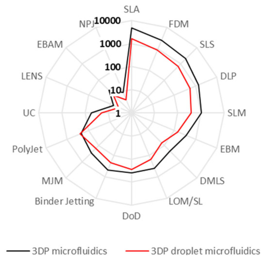 First of all, surveying the distribution of channel dimensions in papers (Figure 3), it is clear that most chips have channels within the 100–500 µm range. This is the range which is comfortably printable on most SLA printers [40,52,53,60,65,84,85,86,87,88,89,90,91,92,93,94,95,96,97,98,99,100], but it is also achievable with material jetting and, after some fine-tuning, with FDM [42,101,102,103,104,105,106,107]. This size regime is still within the microfluidics domain, although larger than mainstream microfluidic channels.