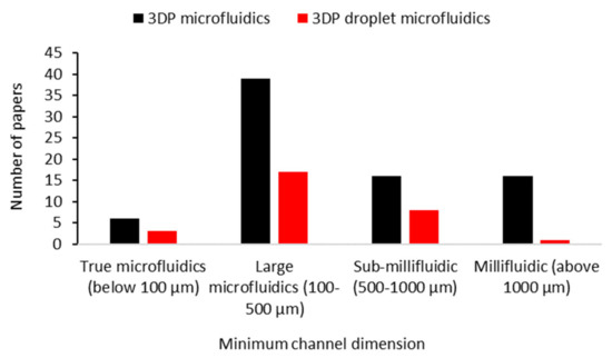 3DP microfluidic chips usually have channels within the large microfluidics size domain of 100–500 µm. Surveying the minimum channel dimensions reported in papers over the last five years revealed that most 3DP microfluidics, including droplet microfluidics, were in the category of large microfluidics with 100–500 µm channel dimensions. As evidenced by our comparison in Figure 7, this dimension range is adequate for various biological and chemical assays. Only a few examples were in the true microfluidics group of <100 µm channel dimensions, which indicates that while the technology is capable of producing smaller feature sizes, most biological and chemical applications do not need it. The size domains and their names were based on [12,41].