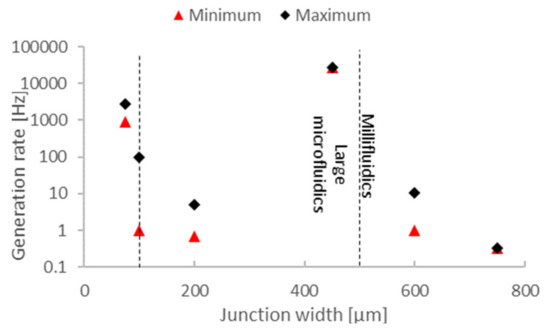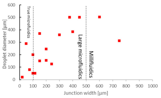 In droplet microfluidics, 3DP microfluidic chips have been mostly used in a 100–500 µm junction width regime (large microfluidics). The droplet diameter changes close to linearly with the junction width, typically also in the 100–500 µm range, although some variations are possible due to different reagents and flow rates used. By using a wider outlet and a lower flow rate, the droplet diameters can be significantly larger than the junction width. Conversely, a high flow rate can result in smaller droplets than the junction width.