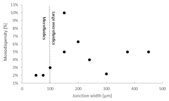 Most demonstrated 3DP droplet microfluidics were able to generate droplets with monodispersities lower than 6%. Comparing the junction width and the reported monodispersities, we can see that most 3DP droplet generators were capable of generating droplets with ~5–6% monodispersities on average in the large microfluidics size domain. In the microfluidics size domain below a 100 µm junction width, a monodispersity better than 3% was also demonstrated.