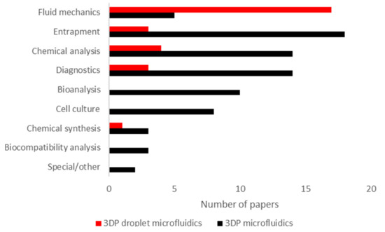 Figure 7 shows the distribution of papers in the categories described above. We also compared the distribution for all 3DP microfluidics papers in general, as well as 3DP droplet microfluidics specifically. For 3DP microfluidics in general, by far the most popular application area is the entrapment of microparticles [39,41,50,55,56,57,61,70,75,89,91,96,99,100,104,113,119,120]. Chemical analysis and diagnostics are also highly popular [42,47,49,52,53,59,67,77,86,90,97,103,106,121,122,123,124,125,126,127,128,129,130]. In comparison, for droplet microfluidics, the most popular application area is fluid mechanics. This is likely due to the fact that the basic technology has not yet been established well enough to have an abundance of more complex applications. Most 3DP droplet microfluidics papers in the last five years have focused on solving the problem of droplet generation [44,69,92,102,107,108,111,112,114,115,116,118]. In the next five years, we will likely see more papers on biological or chemical applications as 3DP microfluidic droplet generation becomes an everyday practice.