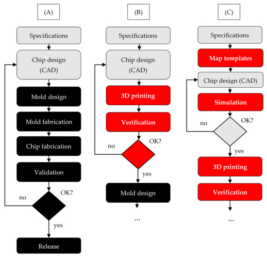 Combined with 3D printing, FEM simulations can be powerful tools that can greatly speed up prototyping and design evolution. In a traditional PDMS–glass microfluidic chip design workflow (Figure 8A), expensive and time-consuming processes such as mold fabrication and chip fabrication must precede design validation and design release. If a design error is made or a new design is needed, molds have to be replaced. Instead, 3DP chips could be used to verify chip designs before the soft lithography mold is designed (Figure 8B). This verification can involve solely flow mechanics testing (e.g., pressure measurements) or testing with a biological or chemical assay [144]. Only after the 3DP design verification should the process continue with mold design, according to Figure 8A. However, to realize the full potential of 3D printing and digital design automation, we propose a third approach (Figure 8C). As mentioned in Section 3.1, design repositories for microfluidic chips are being created. These designs could be used as templates and mapped to desired chip specifications to speed up the design process. Then, CFD or FEM simulations could be used to evaluate the design before it is 3DP and tested for the first time. If the simulation does not yield expected results, the design can be changed. This in silico design evolution cycle can save both time and costs. After 3D printing, there are two possible paths. Either the process continues with the traditional workflow according to Figure 8A, ending in a PDMS–glass end-user device, or the end-user device could itself be 3DP. As we have shown in Section 2, 3DP droplet microfluidics are capable of functioning as both droplet generators and hosting biological or chemical assays. Therefore, in the future, 3DP devices may be used in clinical or research laboratories. We will analyze this possibility further in the next paragraph.