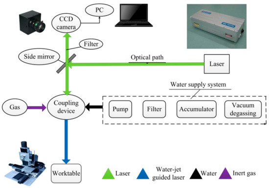 The laser source used in the experiments is Nd:YAG solid-state pulsed laser with a wavelength of 532 nm. Its maximum average power is 30 W and the output beam has a Gaussian distribution. During the experiment, the output frequency was 40 kHz, and the pulse width was 0.3 µs. We developed an experimental platform of WJGL, including the water circulation system, the water-laser coupling unit, and the three-dimensional working platform. In order to reduce the absorption of laser energy by water, the experimental water was filtered, deionized, and degassed.
