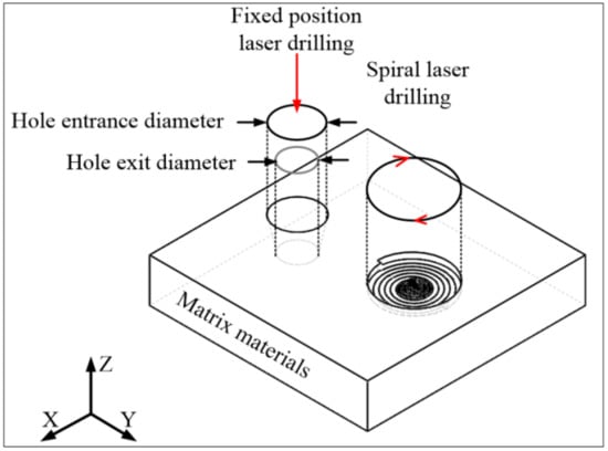 With the advancement of science and technology, microporous structures have broad applications in aerospace, high-sensitivity optical fiber sensors, consumer electronics, three-dimensional integrated circuit packaging and other fields. At the same time, the requirements for microporous processing quality have been constantly improved [1]. However, traditional microporous processing methods have certain limitations: the depth-diameter ratio of microporous formed by mechanical drilling is very small, and is not suitable for processing brittle and hard materials [2]. EDM drilling has low efficiency and can only process conductive material, and the loss of electrodes makes the operation cost of this technology high [3,4,5]. The applicable conditions for electron beam and focused ion beam processing of micro holes are relatively harsh and the needed equipment is expensive [6]. It is difficult to control the corrosion direction when machining micro holes by electrochemical methods, resulting in a relatively smaller diameter of the processed micro holes [7]. In the process of electro hydraulic beam micro hole machining, chip removal is difficult and there are some problems such as easy contamination of the processed sample with the electrolyte [8]. At present, laser processing technology has been widely applied to the microporous processing of metal materials, but for non-metallic materials, especially hard, brittle, and transparent materials, there is no large amount of free electrons, so its absorption rate for continuous laser and long pulse laser is low. It is difficult to achieve high-efficiency processing and the processed microporous have obvious thermal effects, recast layers, and other defects [9,10]. In recent years, ultrafast laser processing technology has gradually entered the field of microporous manufacturing, but it is difficult for this technology to take into account the processing accuracy, quality, and efficiency at the same time, which restricts its further development and application.