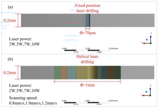 Materials geometric model used for simulation: (a) fixed-position drilling and (b) helical drilling.