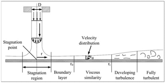 The strong convective cooling effect of water jet is the key of water jet laser processing. The laser action area and the contact surface between the material and the laser are all subjected to the cooling and convection action of the high-pressure water jet. As shown in Figure 4, when the jet reaches the wall of the impacted object, the fluid spreads around the wall form a wall-mounted jet area. The area where the impacted wall faces the nozzle becomes the stagnation zone, and the point corresponding to the center of the jet is called stagnation point where the local heat transfer intensity is the highest. With the increase of , the local heat transfer coefficient decreases monotonously from the highest value at the stagnation point to the surrounding area, and finally the downward trend gradually slows down. The calculation formula for the range of the laminar heat exchange zone formed by the water jet contacting the material is as follows [21]: