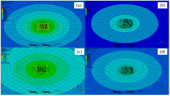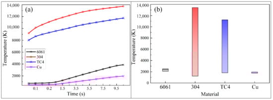 Figure 8a simulates the heat accumulation process inside the material after the fixed-position drilling of the WJGL for 10 s. It can be seen from the figure that the temperature of titanium alloy and stainless steel rise rapidly in the initial stage of laser action, and the material removal temperature can be reached rapidly. As the processing time goes by, the temperature of the material shows an upward trend, while the temperature growth rate shows a downward trend, and the temperature increases slowly and gradually stabilizes at about 5 s. On the contrary, the temperature rise of aluminum alloy and copper is relatively slow at the initial stage of laser action, with the temperature growth rate almost 0, and it rises rapidly at about 1 s, after which the growth rate tends to be stable. Figure 8b is the temperature distribution on the surface of the model after the laser pulse stopped. The temperature difference on the surface of the aluminum alloy and copper is not large, and the minimum temperature and maximum temperature are about 2000 K, indicating that the heat transfer is faster and the whole model is at high temperature after processing. The surface temperature difference between stainless steel and titanium alloy materials is relatively large, the temperature difference on the surface of stainless steel is more than 12,000 K, and the minimum temperature is relatively low. It can be found that the strong cooling effect of the water jet in the WJGL will make a stable temperature difference on the surface of the material. In contrast, the material with lower thermal conductivity has the best cooling effect and the edge temperature of the material is lower.