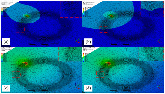 Figure 5 and Figure 6a–d are the simulation of fixed-position drilling of 6061 aluminum alloy (AlMg1SiCu), TC4 titanium alloy (Ti6Al4V), pure copper (T2), and 304 stainless steel (06Cr19Ni10) processed by WJGL, respectively. The laser power is 10 W, and the drilling time is 1.2 s. It can be seen from the figure that the processing depth of copper is the deepest in the same processing time, at 84.6 μm. The heat transfer is the fastest in the radial and axial directions. However, the residual heat around the hole after processing is higher, the temperature is about 1000 K, and the thermal deformation is serious. The machining depth and the diameter of aluminum alloy is 25 µm and 56 µm respectively, which is the smallest among the four materials. It shows that the thermal physical properties of the material directly affect the processing effect. Titanium alloy and stainless steel have a larger hole diameter, about 70 μm, the roundness of the hole shape is kept better, the hole edge temperature is lower, about room temperature, and the thermal deformation is small.