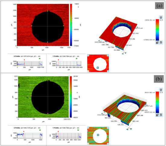 After drilling by the water jet-guided laser processing, the samples were dried by clean compressed air. The surface morphology was studied to understand the machining accuracy. The 3D surface morphology was measured by the Bruker Contour GT-K optical microscope (Bruker, Madison, WI, USA) with a 50× objective, scanning electron microscope (Zeiss, Oberkochen, Germany), and model ZEISS EVO MA 10/LS 10. Hole diameter data were directly obtained from the measured 3D data. For all the data measurements, each micro-hole was measured 6 times, and the test results were averaged.