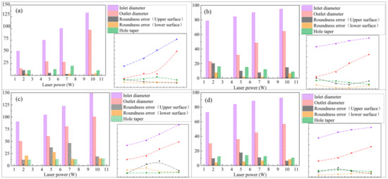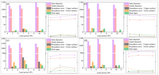 From Figure 12 and Figure 13, it can be seen that when fixed-position drilling is used, the aperture of the upper and lower surfaces of the material has a significant upward trend with the increase of laser power, and the growth rate of the aperture of the upper and lower surfaces remains the same. The aperture of the helical drilling varies slightly with the increase of laser power, and the increase is not obvious. Due to water jet-guide laser drilling, the melting and vaporization of the processed material are the basic elements for forming the hole and the vaporization of the material mainly increases the depth of the hole. The melting of the hole wall material and the vapor pressure in the hole carry the molten material outward. The pulse frequency of the laser is fixed, the higher the laser power, the greater the laser pulse energy and the larger the aperture. During fixed-position drilling, the water jet has stagnant and backflow phenomena in the microporous. The cooling effect and chip removal ability of the material are not as good as the helical drilling. Heat accumulation is more serious, local rapid heating and the thermal deformation, which makes the hole roundness error more bigger. While the water jet can obtain a larger heat transfer area with the material in the helical drilling, keeping the aperture size better and reduce the roundness error. The roundness error of fixed-position drilling decreases with the increase of laser power and when the laser power is 10 W, the error of each material is reduced to within 10 µm.