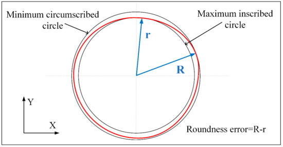 In this paper, two kinds of different paths with 2 W, 5 W, 7 W, and 10 W laser power for four kinds of metal materials on drilling experiment, the samples are detected by Bruker Contour GT-K optical profiler. The test content includes the aperture of the entrance and exit surface, the roundness error of the entrance and exit surface, and the hole taper. The results are shown in Figure 12 and Figure 13. The minimum area method is used to evaluate the roundness error of the hole in this paper and that is, the radius difference of the two concentric circles containing the minimum circumscribed circle and the maximum inscribed circle of the measured circular profile is regarded as the roundness error, as shown in Figure 14.