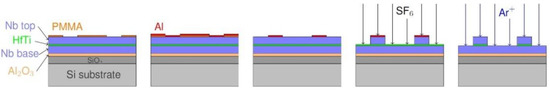 We use 3-inch Si wafer substrates with 300 nm thermally oxidized SiO2 (Figure 1). After a pre-cleaning step of the substrate (in-situ Ar sputter cleaning: 50 W for 2 min), a 30 nm Al2O3 etch-stop layer is grown by magnetron sputtering deposition (MSD) in a high-vacuum chamber at room temperature. Subsequently the Nb-HfTi-Nb trilayer is grown by MSD. The trilayer consists of a 160 nm Nb base layer, 20 to 22 nm Hfwt50%Tiwt50% (HfTi) and a 200 nm Nb top layer for six wafers, which were fabricated for this paper. As mentioned above, the HfTi thickness can be adjusted, to obtain a desired critical current density, in a typical range from 17 to 26 nm [33]. To define the deep sub-µm JJs, a 30 nm Al hard mask is patterned by lift-off, using EBL with PMMA as a positive resist. The Nb top layer is removed by inductively coupled plasma reactive ion etching (ICP RIE). To achieve optimum etching times, we use laser endpoint detection for ICP RIE of Nb and SiO2 layers. For etching the Nb top layer SF6 is used to obtain high etching rates and to ensure steep sidewalls approaching 90°. Ion beam etching (IBE) with Argon ions is applied to remove the HfTi barrier and simultaneously the Al hard mask.