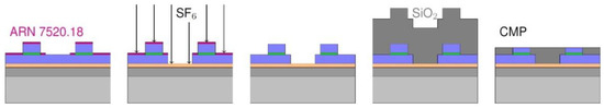 For capacitors with plates in both wiring layers (Figure 7c) and for capacitors with plates in the trilayer and the second wiring layer (Figure 7d), we obtain d = (290 ± 6) and (305 ± 6) nm, which is 97% and 101%, respectively, of the intended thickness of the SiO2-2 layer. The differences to the desired value are within the accuracy of the measurement. Since no CMP step was used for those capacitors, the thickness of the deposited SiO2-2 layer could be adjusted precisely and therefore, the capacitances match the designed values accurately.