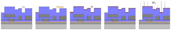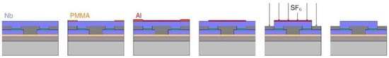 As all Nb layers, Nb wiring 2 is deposited starting with an in-situ Ar sputter cleaning (50 W for 1 min) by MSD (Figure 5). The thickness of the second Nb wiring layer must be comparably large (800 nm) compared to the underlying layers to ensure that the superconducting Nb layer does not break off at the edges, because of the uneven structures when connecting the Nb base layer. For the last Nb etching step, another Al hard mask, which is again formed by an EBL patterned positive resist mask and a lift-off process, is needed. By ICP RIE with SF6 the second Nb wiring layer is patterned.