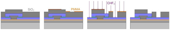 In the next fabrication step, we use PECVD again to deposit another 300 nm thick layer of SiO2 on top of the wafer (Figure 4) to ensure the isolation between the first and second Nb wiring layers. We use a positive resist mask patterned by EBL and etching by ICP RIE with CHF3 to create small windows (vias) in the SiO2 layer. Here we can open contact windows down to the Nb base layer and to the first Nb wiring layer.