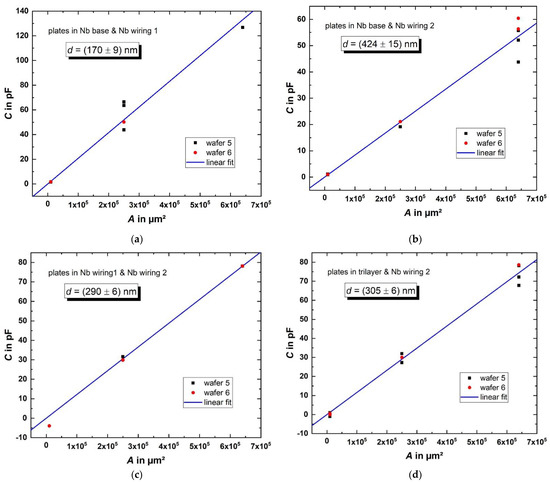 Measured capacitances (corrected values) of capacitors (corresponding to Figure 6) on wafers 5 and 6 with different sizes (100 µm × 100 µm … 800 µm × 800 µm). The thickness of the dielectric layers was calculated according to Equation (1) from the fit parameters for capacitors with plates in the Nb base and first wiring layer (a), in the Nb base and second wiring layer (b), in the two wiring layers (c) and in the trilayer and second wiring layer (d).