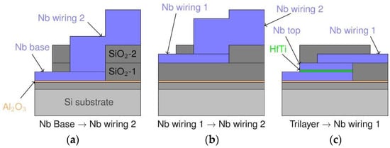 In order to examine the quality of isolation and vias between Nb layers, we fabricated and characterized parallel-plate capacitor structures with varied dimensions, 10 µm × 10 µm to 800 µm × 800 µm, between all independent layers of Nb (base, wiring 1, wiring 2) and additionally between the trilayer and the second wiring layer. In Figure 6 the different types of capacitors are sketched.