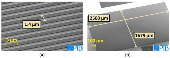 An AR of up to 2.2 × 106 (with n = 750 and p = 1.4 µm) was achieved. Figure 9 shows scanning electron microscopy (SEM) images of a fabricated IDC, indicating that large structures with small linewidths can be fabricated without any visible defects. The capacitance of the IDCs was measured in liquid He at T = 4.2 K with an LCR-meter. To estimate C from the geometry of the IDCs, we used the relation ([41] p. 96, Equation (4.47a)):