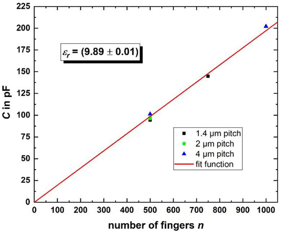 The measured capacitances, reduced by an offset (33.6 pF), which is attributed to the parasitic capacitances of the measuring system, are shown in Figure 10. We used a linear fit function according to Equation (2) to derive the effective dielectric constant εr,eff = (9.89 ± 0.01), which deviates only 1% from the value, which was estimated for the layout beforehand. Regarding the capacitances, for IDCs with n = 500, we expected 100 pF per design. The mean value of the measured capacitances for these IDCs, having different pitches (1.4 µm, 2 µm, and 4 µm), was (97 pF ± 3) pF.