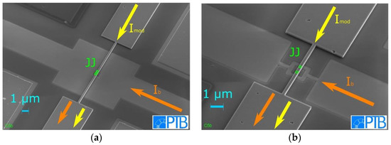 - Morosh, V.; Linek, J.; Müller, B.; Martínez-Pérez, M.J.; Wolter, S.; Weimann, T.; Beyer, J.; Schurig, T.; Kieler, O.; Zorin, A.B.; et al. Transport and noise properties of sub-100-nm planar Nb Josephson junctions with metallic HfTi barrier for nanoSQUID applications. Phys. Rev. Appl. 2020, 14, 054072. [Google Scholar] [CrossRef]