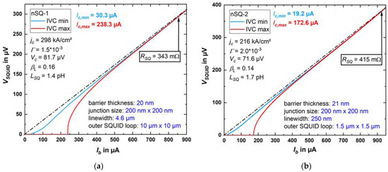 The current–voltage characteristics (IVCs), with Imod adjusted to obtain maximum critical current Ic,max and minimum critical current Ic,min, are shown in Figure 12a for an exemplary SQUID of the type SQ-1 with JJs having a barrier thickness of dHfTi = 20 nm and in Figure 12b for another exemplary SQUID (type SQ-2) with a slightly thicker HfTi barrier (dHfTi = 21 nm). The IVCs with maximum critical current can be well described within the resistively and capacitively shunted junction (RCSJ) model [43,44], with negligible capacitance and with negligible noise rounding, which is consistent with the small noise parameter Γ = 2πkBT/( I0Φ0) ≈ 2 × 10−3 (with the Boltzmann constant kB and average single JJ critical current I0 = Ic,max/2). The junctions exhibit a critical current density jc ≈ 298 kA/cm2 and jc ≈ 216 kA/cm2 for SQ-1 and SQ-2, respectively. They have a normal resistance RSQ ≈ 343 mΩ (SQ-1) up to 415 mΩ (SQ-2), leading to characteristic voltages in the range of Vc = Ic,maxRSQ ≈ 82 µV (SQ-1) resp. 72 µV (SQ-2).