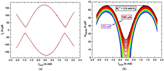 For SQ-2, we show in Figure 13a the critical current oscillations Ic(Imod); Figure 13b shows voltage oscillations V(Imod) for different values of fixed bias current close to Ic,max. From the oscillation period (current Imod,0 required to couple one flux quantum Φ0 = h/2e ≈ 2.0678 × 10−15 Vs to the SQUID) we determine the inverse mutual inductance Mf−1 = Imod,0/Φ0 between the modulation line and the SQUID, which ranges from about 2 mA/Φ0 (SQ-1) to 2.8 mA/Φ0 (SQ-2) for the two exemplary SQUIDs. We note that Mf−1 for nSQ-1 is larger than for SQ-2, which may be due to flux focusing, caused by the larger washer of SQ-1 [45]. For SQ-2, the small shift ΔImod = ±83 µA of the maxima in Ic(Imod) for opposite polarity (c.f. Figure 13a) is, as expected, very close to the symmetric single JJ critical current Ic,max/2 = 86.3 µA. This means that the asymmetry in the Ic(Imod) oscillations is likely dominated by inductance asymmetry due to asymmetric current biasing of the SQUIDs, and that an asymmetry in the critical currents of the two JJs is negligible.