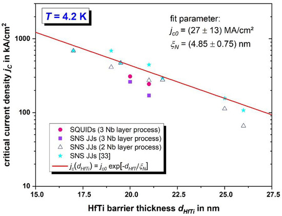 can be used [33] to describe the dependence of the critical current density on the HfTi barrier thickness, where ξN is the coherence length in the normal conducting barrier. In ref. [33], the fitting parameters are jc0 = (27 ± 13) MA/cm2 and ξN = (4.85 ± 0.75) nm. In general, the fit function agrees well with our measurement results for SQUIDs and single JJs. Since our data were determined using the designed area, which is somewhat larger than the effective area of the JJs, our data are slightly below the curve from ref. [33].