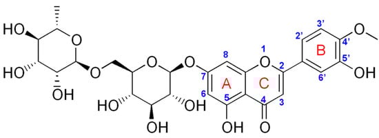 Diosmin (3’,5,7-trihydroxy-4’-methoxyflavone 7-rhamnoglucoside) (DIO) (Figure 1), a natural flavone found in Rutaceae [], commonly known as the citrus family, is easily obtained by hesperidin dehydrogenation. It was first isolated in 1925 from Scrophularia nodosa, and in 1969 it was introduced as a therapeutic agent []. After ingestion, diosmin is transformed into its aglycone form, diosmetin, and it has multiple beneficial effects on human health. This is due to the manifold biological and pharmacological activities possessed by diosmin, among which can be mentioned antioxidation, antidiabetes, anti-inflammation, anti-microorganism and anti-mutagenic activities, as well as neurological, cardiovascular, liver, retinal and renal protective effects []. Interesting and probably less known is the fact that DIO and its major metabolite, diosmetin, can be used in the treatment of Alzheimer’s disease (AD) [] and as a memory restoring agent in the treatment of dementia []. DIO has beneficial effects on low neurological scores induced by brain damage on memory and long-term action potential by decreasing the tumor necrosis factor-alpha (TNF-α) proinflammatory cytokine production [,]. The clinical progression of AD is supported by the generation and accumulation of amyloid-(A) peptide. The inhibition of the glycogen synthase kinase-3 action by DIO and diosmetin has been shown to decrease the production of cerebral soluble Aβ and Aβ oligomer and tau hyperphosphorylation, resulting in the restoration of cognitive impairment in mice [,]. Elham et al. [] established that any of diosmetin’s memory-enhancing properties in the chronic unpredictable mild stress condition may be linked to its ability to effectively regulate oxidative stress by increasing overall antioxidant potential and decreasing lipid peroxidation, while maintaining regular corticosterone levels. However, further research is required to determine the exact mechanism by which DIO, after its metabolization to diosmetin by the intestinal flora, causes memory deficits in chronic stress. Nowadays, the most popular and frequent uses for DIO are in the treatment of chronic vascular diseases and hemorrhoids. Thus, despite the poor solubility in water, diosmin, along with hesperidin, is present in various pharmaceutical formulations, food supplements or natural remedies that have phlebotonic and vascular-protecting properties against venous insufficiency [].