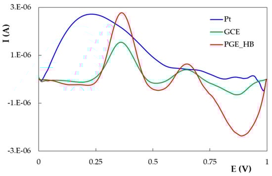 DIO voltammetric response was investigated by DPV on solid conventional working electrodes, i.e., Pt and GCE, and on a disposable PGE using an HB-type graphite pencil lead in NaOH as supporting electrolyte, because this is the medium in which DIO solubility is highest [] due to the fact that in alkaline conditions DIO is ionized as a result of the dissociation of hydroxyl groups []. As can be observed in Figure 2, in an alkaline medium, DIO presented an intense and very broad signal on the Pt electrode, whereas two oxidation peaks were recorded on the carbon-based electrodes, and the one situated at a less positive potential (0.362 V) was higher. Despite the fact that the most intense anodic signal was observed at the HB-type PGE (PGE_HB), the sensitivities of the two carbon electrodes were similar (0.113 and 0.118 A × L/mol × cm2 for the PGE_HB and GCE, respectively). For further electrochemical investigations of DIO, the PGE was selected as the working electrode due to the following reasons: (i) it is disposable and its simple replacement is more rapid than the cleaning step of the solid electrode active surface and (ii) the electrode active surface area can be adjusted by the proper selection of the lead length immersed in the analyzed solution. The study started with the HB-type PGE because this kind of graphite pencil lead is well known and most commonly used. Graphite pencil leads are composite materials containing, besides graphite, a binder (clay or high polymer) and a lubricant (wax). Their hardness degree and notation according to the European Letter Scale (from 8H to 9B, through HB) depend on the graphite/binder mass ratio. The B (from blackness) type leads have more graphite and are softer, whereas the harder (H-type) composites have a higher binder content [,]. DIO oxidation signals were investigated by DPV on graphite pencil leads of different hardness (2B, B, HB, H and 2H) in both NaOH (due to DIO solubility in this medium, as mentioned above) and BRB pH 1.81 solutions because our previous investigations emphasized that many polyphenols present higher and better-defined anodic peaks in acidic media [,,,]. To characterize and compare the electrode materials, the sensitivity (S, expressed as A × L/mol × cm2) was used as a parameter independent of the electrode’s area, analyte concentration and supporting electrolyte. Despite the fact that all investigated PGEs were composite materials having the same constituents, the sensitivity of DIO oxidation response was different when using several graphite lead types. This fact can be attributed to the various graphite/high polymer ratios of the corresponding graphite leads. When NaOH was used as the supporting electrolyte, the sensitivity of the main oxidation signal of DIO was almost the same for leads of intermediate level of hardness (HB) and for the next hardest ones (H), which contain a higher proportion of polymer, whereas in acidic media (BRB pH 1.81), the H-type PGE clearly generated the most sensitive DIO oxidation signals in comparison to all the other investigated graphite leads of different hardness (Table 1). Therefore, as the highest sensitivities of the DIO anodic signals were recorded on the H-type PGE, in both acidic and alkaline media, PGE_H was selected as the working electrode for the next investigations.