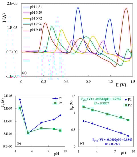 On PGE_H, DIO presented two anodic DPV signals up to pH 9.00 and three peaks in more alkaline media (Figure 3a). This observation was in accordance with previous reports indicating that flavones are transformed into chalcone derivatives in NaOH solution []. By increasing the solution pH, the signals decreased until pH 3.29 and increased at higher pHs (Figure 3b), whereas their peak potentials shifted towards less positive values, indicating that the oxidation processes were accompanied by proton exchanges. Comparing the slope values of the linear Ep = f(pH) dependencies (Figure 3c) with the theoretical one of 0.05916x/n, according to the Nernst equation, where x and n represent the number of exchanged protons and the number of exchanged electrons, respectively, one can conclude that equal numbers of protons and electrons are involved in both DIO oxidation reactions.