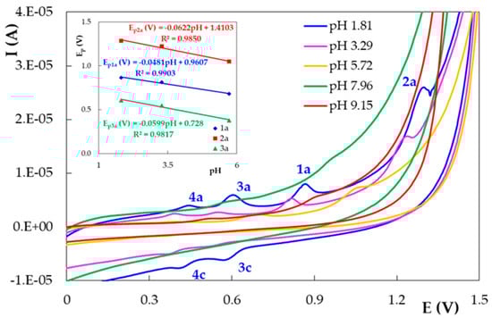 The peak potential values of the signals observed in the second potential cycle decreased with the increase in pH, suggesting that the corresponding electrode reactions also involved protons. It must be specified that peaks 3a, 1a and 2a appeared at pH values up to 5.72, whereas the signals 3c, 4a and 4c could be observed only in acidic media (pH 1.81 and 3.29, respectively) (Figure 5 inset). According to the slope values of the Ep = f(pH) plots for the DIO cyclic voltammetric peaks, all the redox processes generating them involved an equal number of protons and electrons, a fact demonstrated also by DPV for the main anodic peaks (1a and 2a).