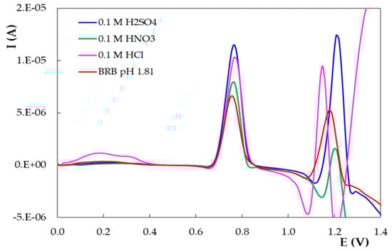 As the above-discussed results revealed that the highest main oxidation signal (1a) of DIO on PGE_H (Figure 3b, Figure 4 and Figure 5) was recorded in a solution of pH 1.81, the effect of some acidic supporting electrolytes on the DPV response of DIO was further tested (Figure 6). The results indicated that the most sensitive DIO anodic signals were obtained in 0.10 mol/L H2SO4; therefore, this medium was used as the supporting electrolyte in the next investigations.