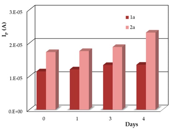 It is well known that antioxidant solutions are not very stable; hence, the stability of the DIO stock solution was tested by monitoring the voltammetric response of the working solutions freshly prepared from the same stock solution after several days of storage in the refrigerator (Figure 7). The increase in both DIO anodic peak currents (1a and 2a) indicated that some transformations occurred in the solution; therefore, the stock solution must be prepared daily.