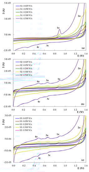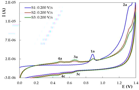 A mechanism for the reactions generating peaks 1a, 3a and 3c was suggested by Li et al. [], but there is no literature information regarding peaks 2a, 4a and 4c. However, in order to establish a mechanism for the processes generating these signals, more detailed studies using complementary methods (e.g., coulometry) are necessary.