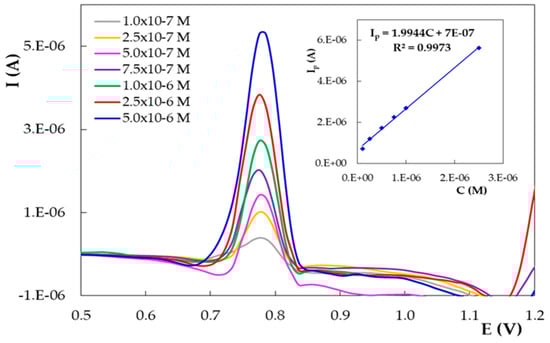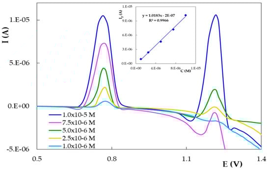 For the quantitative voltammetric determination of DIO on the disposable electrode, the more sensitive DPV method was applied using the previously optimized working conditions (PGE_H and 0.10 mol/L H2SO4). The influence of the analyte concentration on DIO oxidation peaks was investigated in the range 1.00 × 10−7 to 2.50 × 10−5 mol/LDIO. As can be observed from Figure 10, both DIO anodic signals were enhanced by the concentration increase from 1.00 × 10−6 to 1.00 × 10−5 mol/L DIO, but for further quantitative investigations, only the peak situated at ~0.780 V was exploited due to the fact that it is not affected by the background current. The current of this peak varied linearly with DIO concentration (Figure 10 inset).