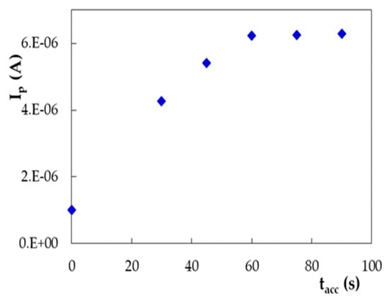 The influence of the accumulation time (tacc) on DIO DPV oxidation peak current recorded on PGE_H for 1.00 × 10−6 mol/L DIO in 0.10 mol/L H2SO4; Eacc = 0.000 V.