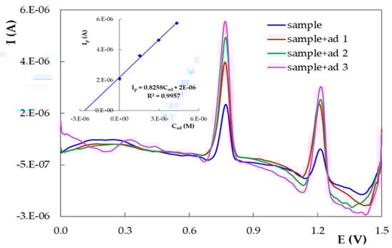 Five tablets of the Revada dietary supplement with a claimed content of 0.6000 g DIO per tablet were accurately weighed and thoroughly mixed to a powder using a porcelain mortar and pestle. An appropriate mass of this powder, required to obtain 20.00 mL of 2.60 × 10−4 mol/L DIO solution, was dissolved in 2.00 mL 0.20 mol/L NaOH solution and 10.00 mL deionized water, and the suspension was filtered through a Whatman filter paper. The filter paper was rigorously washed with deionized water in order to ensure complete analyte recovery. The filtrate and the washing solutions were collected in a 20.00 mL volumetric flask and diluted to the mark with deionized water. Aliquots of this solution were 100-fold diluted with 0.10 mol/L H2SO4 to keep the sample concentrations within the linear range of the method and reduce the matrix effects []. Further, the samples were analyzed by DPV before and after each of the three successive additions of 0.30 mL of 5.26 × 10−4 mol/L DIO standard solution.