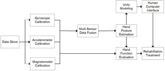 The data glove system discussed in this paper aims to help physicians evaluate patients’ hand function during rehabilitation. To get the joint angles of hand attitudes, 12 nine-axis inertial sensors are integrated with the Micro Controller Unit (MCU) and Universal Asynchronous Receiver/Transmitter (UART) modules on the glove. Several calibration algorithms are implemented to avoid errors caused by the accelerometer, gyroscope, and magnetometer. In addition, a human–computer interaction module is developed in the Unity platform. A grasping ball experiment is conducted to demonstrate how the glove system can be used to evaluate dynamic hand functions.