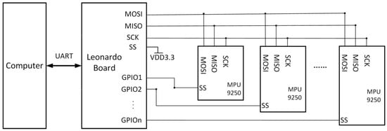 The hardware of our data glove system includes several parts: (1) some IMMUs for capturing the angles of hand joints; (2) a microcontrol unit for data collection and transmission; (3) a USB connection wire or wireless Bluetooth transmitter; and (4) a PC or laptop for receiving sensor data and reconstructing hand motions. The MEMS-based sensors are uniquely suited for wearable applications due to their advantages of low power consumption, compactness, and high precision. MPU-9250 units from InvenSense, Inc. are used to capture the angles of joints when hand exercises are done. The nine-axis sensor MPU-9250 can be considered as a combination of a six-axis IMU and a three-axis compass, one is the six-axis IMU MPU6515, the other is the AK8963 3-axis magnetometer from Asahi Kasei Microdevices (AKM). The angular velocity range of the gyroscope is set to ±1000°/s and the acceleration range of the accelerometer is set to ±8 g. The sample rate is set to 100 Hz for all the sensors, which is high enough to capture most human hand motions. To achieve better fusion performance, a multi-sensor fusion algorithm is developed to work with the onboard motion fusion processor that comes with MPU-9250. A Leonardo microprocessor chip is used to collect data from the IMMUs. The microprocessor controller has 21 in–out digital ports, 7 Pulse Width Modulation (PWM) ports and 6 analog input ports to connect with 12 sensors via an SPI bus, as shown in Figure 2. Both the wired UART connection and Bluetooth wireless connection are tested in our glove system. The results show that the wired UART connection is more efficient and reliable than Bluetooth wireless connection, especially at a high transmission rate.