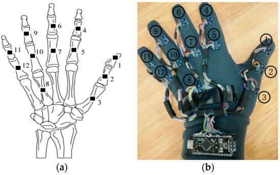- Liu, Q.; Qian, G.; Meng, W.; Ai, Q.; Yin, C.; Fang, Z. A new IMMU-based data glove for hand motion capture with optimized sensor layout. Int. J. Intell. Robot. Appl. 2019, 3, 19–32. [Google Scholar] [CrossRef]