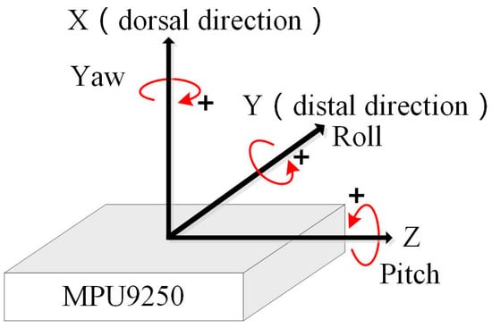 The data processing is as follows: The microcontroller of the data glove sends the data from IMMU sensors to the computer frame by frame, and then the received data are preprocessed by parity frame check and frame decoding. The raw sensor data must be calibrated before they can be fused. Since the environmental influence on accelerometers and gyroscopes is mostly negligible, the calibration parameters of the accelerometer and gyroscope can be used for a long time after initial calibration. Unlike the accelerometer and gyroscope, the magnetometer needs to be recalibrated because it is subjected to the disturbance from environmental ferromagnetic materials. The attitude of each IMMU sensor can be estimated with a multi-sensor fusion algorithm using calibrated acceleration, angular velocity, and geomagnetism data. The orientation of the IMMU sensors on the glove of left hand is as defined in Figure 6 with the International Society of Biomechanics (ISB) recommendations on definitions of joint coordinates [26].
