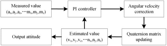 As proven by the calculation process of the initial Euler angle, the yaw, pitch, and roll angles can be calculated directly from the acceleration, angular velocity, and magnetic field data in the static state. However, when the sensor is in motion, extra linear acceleration is introduced, resulting in inaccurate calculation of the sensor’s attitude. In addition, the integral drift still exists when angular velocity is used to calculate the attitude after sensor calibration. In this paper, a complementary filter algorithm is applied to solve the multi-sensor fusion problem [28,29]. The essence of multi-sensor fusion is to use the proportional–integral (PI) method to calculate the error between the estimated and measured values of acceleration and geomagnetism, and apply this error to correct the updated quaternion. The sensor fusion process is as shown in Figure 7.