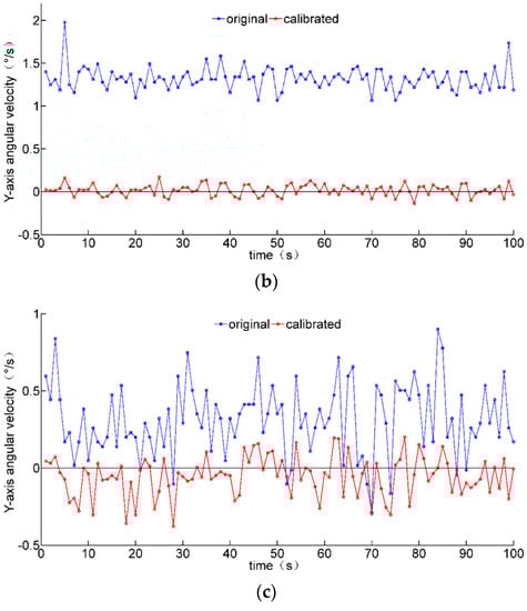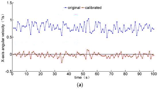 Comparisons of static gyroscope data before and after calibration. (a) X-axis angular velocity; (b) y-axis angular velocity; (c) z-axis angular velocity.